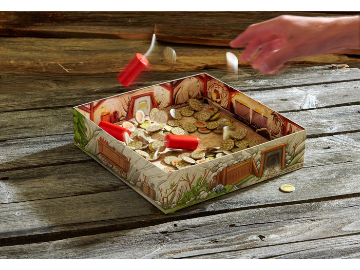 - 1 mine d’or (partie inférieure de la boîte avec 2 inserts), 4 personnages avec coffre, 4 bâtons de dynamite, 4 dépôts, 1 montre (= compte-tours), 160 tuiles : 82 rochers, 35 pépites d’or licites, 35 pépites d’or illicites, 4 tuiles spéciales (1 chauve-souris, 1 serpent, 1 rat, 1 fantôme), 4 tuiles d’action (1 pioche, 1 dynamite, 1 revolver, 1 étoile de shérif), 1 règle du jeu.