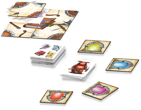 Chaque joueur prend 1 set de 4 tuiles équipement de versos identiques et reconstitue 1 arme.