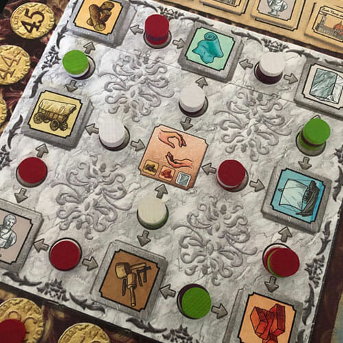 Chaque commerçant dispose de 10, 12 ou 15 employés (les disques) dont 2 ou 3 sont blancs et qui doubleront les actions choisies lors de leur placement.