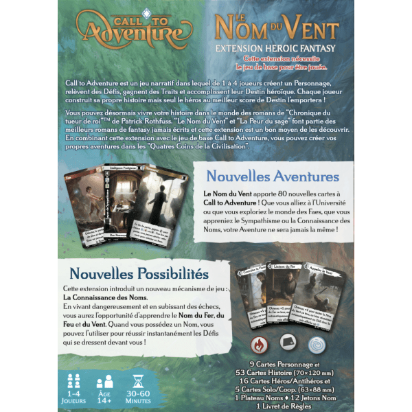 Dans Call to Adventure : Le nom du vent de nouvelles possibilités s'offrent à vous pour une expérience enrichie qui vous plonge au cœur d'une épique aventure dont vous êtes le héros. Découvrez notamment la "Connaissance des Noms", une magie basée sur l’apprentissage du véritable "Nom des choses" afin d'en acquérir la maîtrise, et de nouvelles cartes Personnage pour un changement de l'environnement.