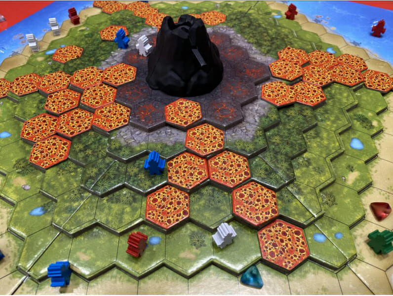 Carcata est un jeu de stratégie léger comprenant un volcan en forme de catapulte de Roberto Fraga.