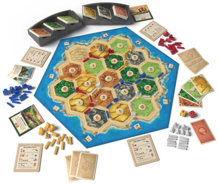 La mise en place consiste à placer au hasard de grandes tuiles hexagonales (chacune représentant l'un des cinq types de terrain produisant des ressources - ou le désert) en forme de nid d'abeille et à les entourer de tuiles d'eau, dont certaines contiennent des ports d'échange. Un disque numérique, dont la valeur correspondra au lancer de deux dés à 6 faces, est placé sur chaque tuile de terrain. Chaque joueur reçoit deux colonies (maisons) et des routes (bâtons) qu'il place aux intersections et en bordure des tuiles de terrain. Les joueurs reçoivent une main de cartes de ressources en fonction des tuiles de terrain auxquelles leur dernière colonie est adjacente. Un pion voleur est placé sur la tuile désert.