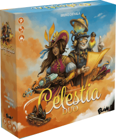 L'univers de Celestia s'étend dans ce jeu coopératif pour 2 joueurs à communication limitée, mêlant course-poursuite, prise de risque et stratégie. Au cours de votre périple, partagez astucieusement vos cartes pour déjouer les embuscades. Anticipez la main de votre partenaire, car si l'un de vous, à son tour, ne peut pas combattre un dé, l'avion subira des dégâts. Arrêtez-vous au bon moment dans les villes volantes pour faire le plein et recruter des passagers aux compétences utiles... Au risque de laisser filer le chef des pirates !