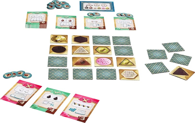 Dans le jeu Chocolates, il s'agit d'explorer petit à petit les tuiles de chocolat afin de faire les bonnes affirmations au bon moment : Y a-t-il exactement trois chocolats blancs dans la boîte ? Ou sont-ils à l'extérieur ? Combien y a-t-il de chocolats triangulaires ? Plus que de ronds ? Y a-t-il des chocolats au lait adjacents ?
