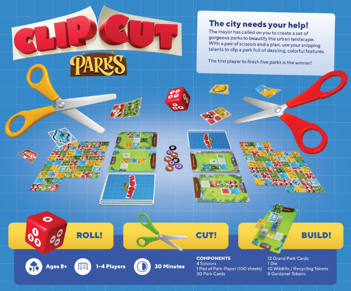 La ville a besoin de votre aide! Le maire vous a demandé de créer un ensemble de superbes parcs verdoyants pour embellir le paysage urbain. Avec une paire de ciseaux et un plan, utilisez vos talents de coupeur pour découper un parc rempli de caractéristiques multicolores éblouissantes. Le premier joueur à compléter cinq cartes de parc gagne!