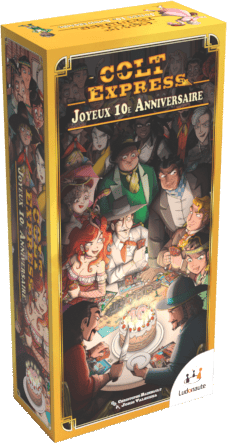 Colt Express - Joyeux 10e Anniversaire est l'édition anniversaire du célèbre jeu familial dans lequel les joueurs incarnent des bandits “desperados” qui se lancent à l’attaque d’un train de voyageurs. Accessible dès 10 ans, pour des parties de 40 minutes, de 2 à 7 joueurs, édité par Ludonaute.
