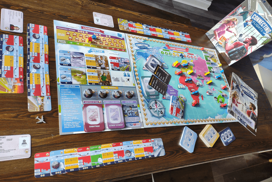 Les cartes aéroport, avion et passager, qui peuvent être achetées aux enchères, ont été conçues pour s'assembler (lorsqu'elles sont posées en ligne) de manière à valider visuellement tous les vols. Les vols plus longs nécessitent de plus gros camions de carburant, de sorte que la gestion de l'ordre des vols vers différentes destinations géographiques devient un mini-puzzle d'une complexité croissante à mesure que les joueurs acquièrent plus de passagers, d'avions et d'aéroports.