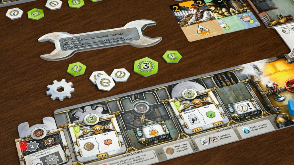 À votre tour, vous pouvez soit jouer une carte d'ingénieur, soit tourner la roue de corrosion de votre usine :