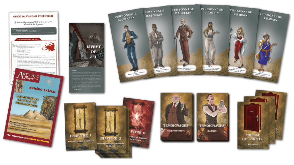 - 1 livret de jeu (notice et solution) 6 livrets « personnage » 30 cartes (chapitres, fouilles de l’hôtel et témoignages du personnel) 1 guide du parfait enquêteur 1 Artchéo’ Mag 1 source audio Une connexion internet est nécessaire pour la mission collaborative.