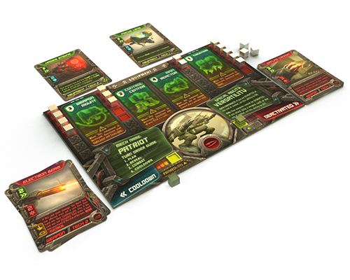 Les joueurs choisissent leur mech préféré pour le combat, chacun offrant une set différent de cartes pour commencer le jeu et des pouvoirs uniques.
