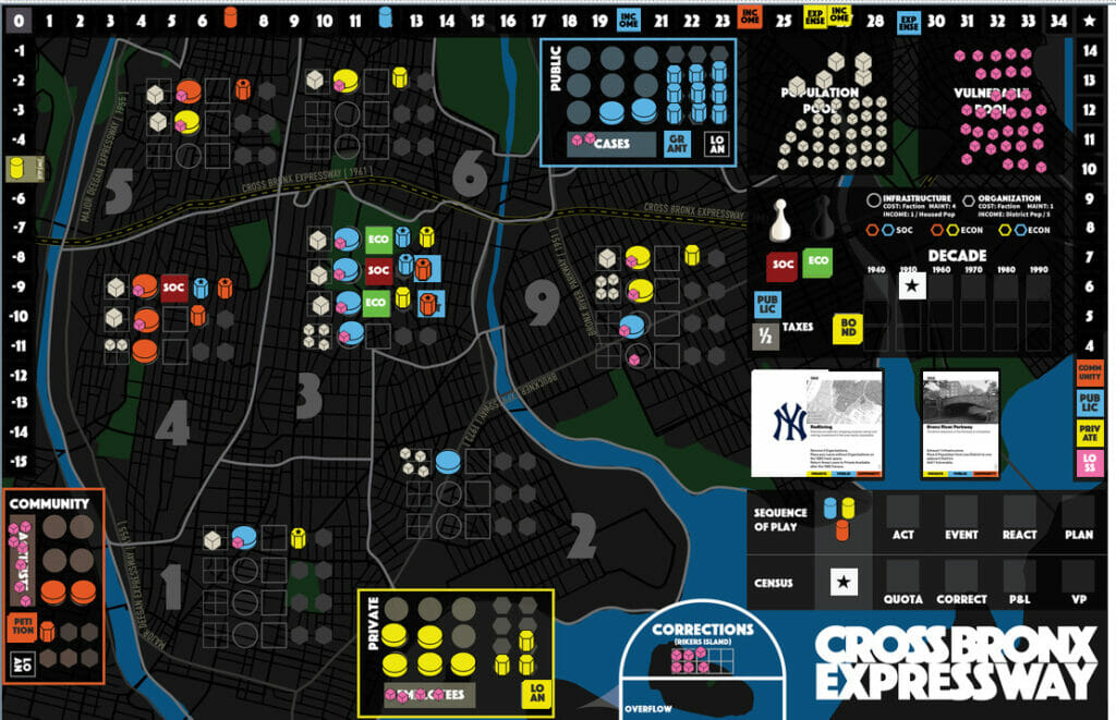 Cross Bronx Expressway modélise cette riche histoire sous la forme d'un jeu économique compétitif de construction de ville avec des conditions de perte collective. Trois factions jouables - publique, privée et communautaire - tentent de sauver la ville du bord de la faillite et de protéger la population vulnérable du Bronx tout au long de cette période tumultueuse, tout en s'efforçant d'atteindre leurs propres objectifs contradictoires. Le jeu se déroule à l'aide d'un jeu d'événements partagé, divisé en décennies. Chaque décennie présente une série semi-aléatoire de cartes historiques dont les effets se produiront toujours mais pourront être manipulés par les joueurs. Les factions effectuent des actions autour de ces événements afin d'en atténuer les effets, tout en espérant faire pencher la balance en leur faveur. Des infrastructures seront construites et parfois démolies, des coalitions formées et abandonnées, des populations logées et déplacées, et des personnes vulnérables encouragées et écartées, tandis que chaque faction lutte pour ne pas s'endetter et atteindre ses propres objectifs. À la fin de chaque décennie, les chiffres du recensement sont comptabilisés pour déterminer quelles factions ont atteint leurs objectifs et à quel prix. Si elles parviennent à maintenir la ville à flot, chaque décennie offre aux joueurs de nouvelles opportunités pour transformer le South Bronx selon leur propre vision, mais si trop de personnes vulnérables sont perdues ou si la ville fait faillite, tout le monde sera perdant. Pouvez-vous coopérer mieux que ne l'ont fait les acteurs historiques et tirer le South Bronx du bord du désastre ?