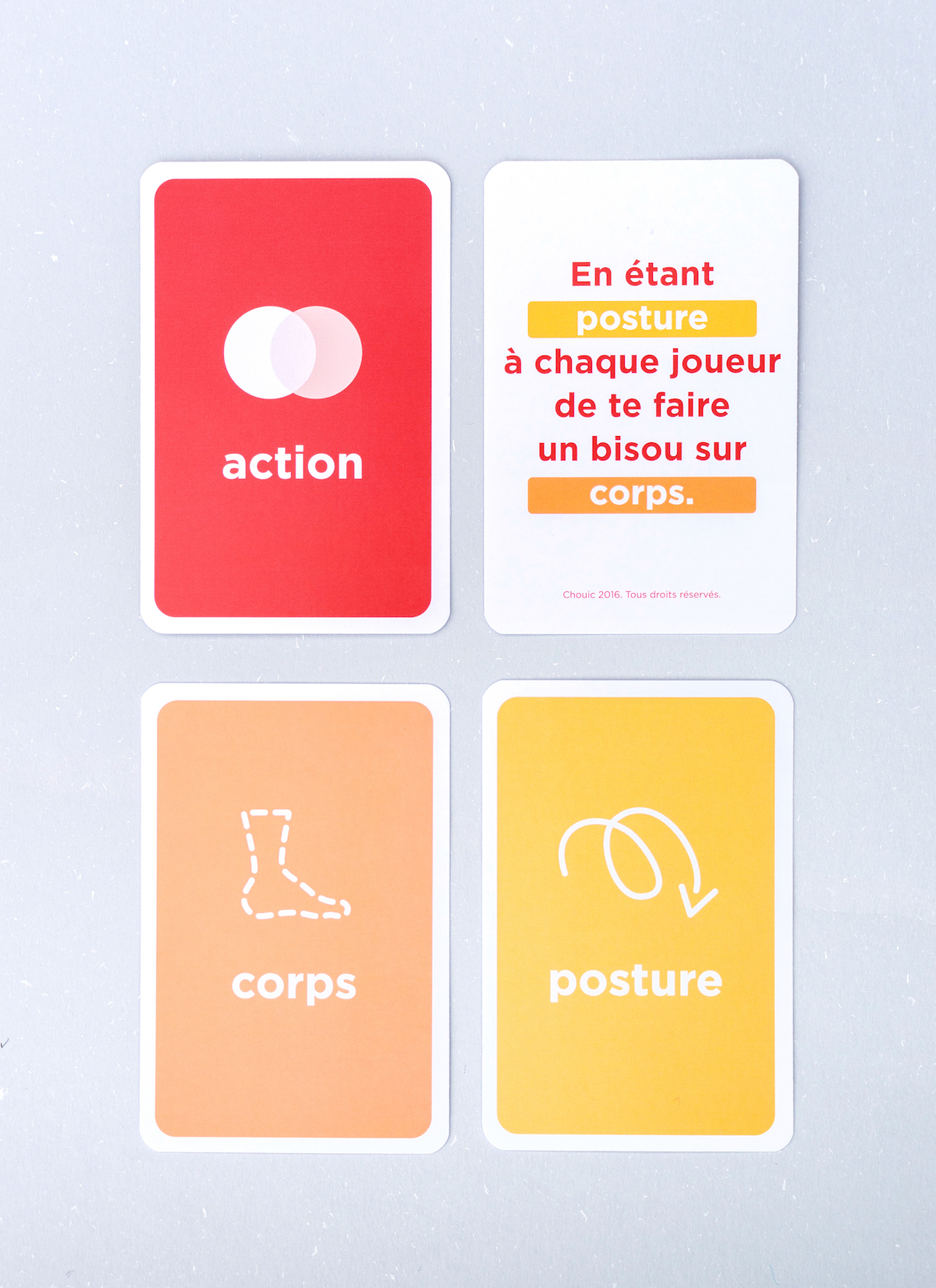 Pour une revisite complète du jeu Action ou Vérité, Culot comprend des cartes Posture et des cartes Corps. Pas question de rester posé dans son canapé : debout, à plat ventre, à genoux… Etre culotté, c’est du sport ! BOUGEZ AVEC CULOT ! Les combinaisons avec les Actions et les Vérités sont quasi-infinies pour des parties différentes à chaque soirée. Les gages et les questions sont à chaque fois réinterprétés, en fonction du joueur qui est désigné.