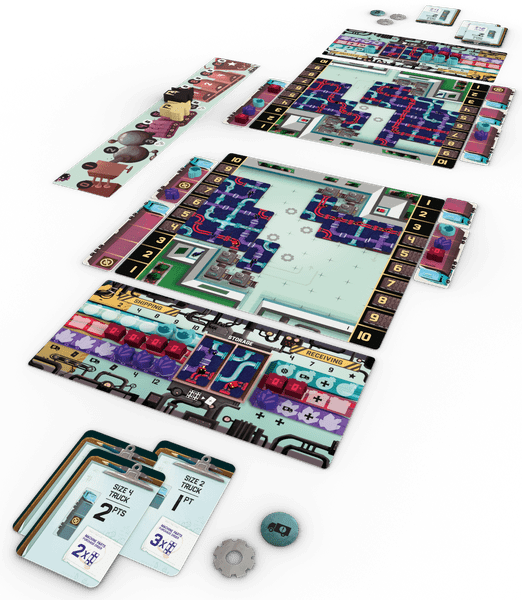 Curious Cargo est un jeu à deux joueurs dans lequel vous affrontez votre adversaire en construisant l'infrastructure de votre installation, en faisant appel aux camions au bon moment, tout en chronométrant parfaitement l'expédition et la réception des marchandises pour marquer le plus de points. Reliez un réseau de lignes entrelacées à vos espaces d'expédition et de réception. Jouez avec des tuiles de convoyeur bicolores, ou augmentez le niveau d'expérience et jouez avec les trois couleurs. Expédiez vos jetons de cargaison personnalisés à votre adversaire pour interférer avec ses plans logistiques !