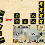 1/ On lance les dés noirs et on les place sur la tuile quête en cours en fonction de leurs symboles