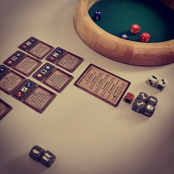Cette boîte comprend 13 dés, 7 cartes de médailles/spécialistes, 6 plages avancées et 1 dé noir spécial, "Le Kommandant", qui apporte une couche supplémentaire de difficulté aux deux jeux.