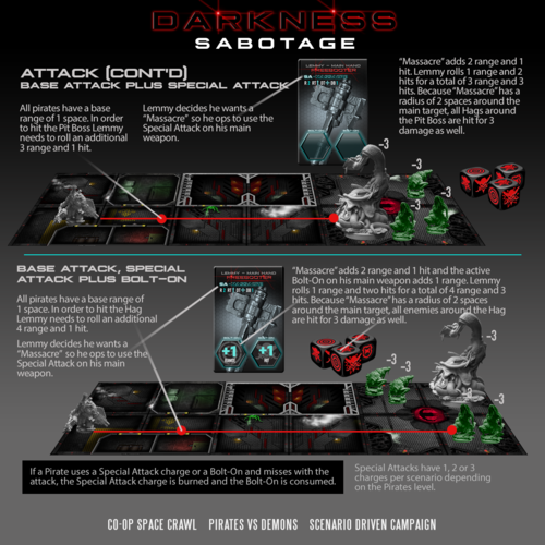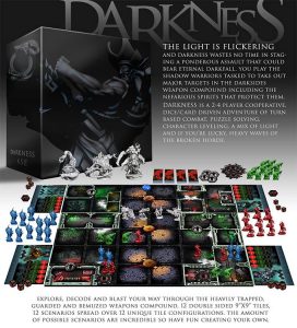 Coopération, cartes à explorer émises aléatoirement, dés d'action, combat au tour par tour, résolution d'énigmes, armes puissantes, de vilain odieux...