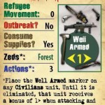 Si à un moment de la partie, le centre de la ville est contrôlé par les zombies, c'est la défaite. Par contre, vous l'emporterez si vous résistez jusqu'à ce que la Garde Nationale débarque. On pioche une carte événement au début de chaque tour, on découvre le nombre de point d'action dont on dispose pour faire agir nos perso, les mouvements potentiels des réfugiés et des zombies, notre conso de vivres et de munitions et les risques de prolifération de l'épidémie.