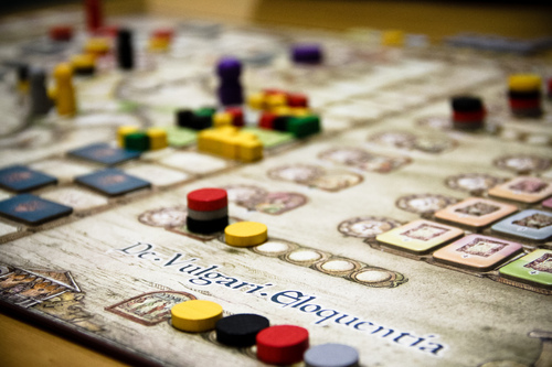 De Vulgari Eloquentia est un jeu riche, passionnant et aux possibilités multiples. Dans cette quête pour la connaissance, parviendrez-vous à réunir les manuscrits des différents dialectes italiens ? Percerez-vous les secrets de la bibliothèque du Vatican ? Deviendrez-vous un riche et puissant marchand ? Ou entrerez-vous dans les Ordres et gravirez la hiérarchie de l’Eglise, jusqu’à, pourquoi pas, devenir le prochain Pape ?