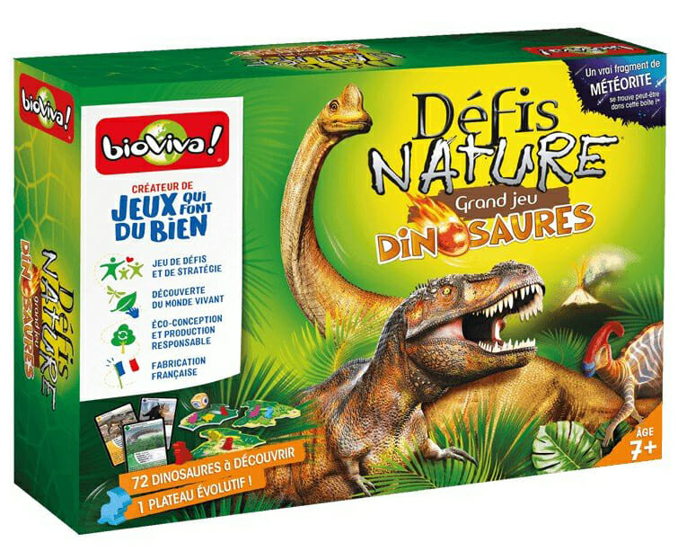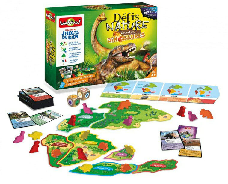 Mais attention ! Les continents bougent au cours de la partie, placez vos dinosaures astucieusement avant qu’ils ne s’écartent. La partie s’achève par la chute d’une météorite géante, qui serait responsable de la grande extinction des dinosaures. Le joueur qui remporte le plus de territoires gagne la partie de Défis Nature – Grand Jeu Dinosaures. Qui l’emportera avant la grande extinction des dinosaures ?