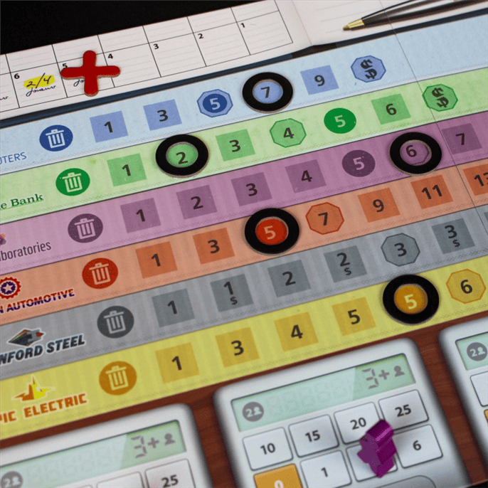 Ces deux mécanismes sont combinés à des éléments boursiers afin d'inciter les joueurs à prendre en compte de multiples facteurs lorsqu'ils vendent une action.