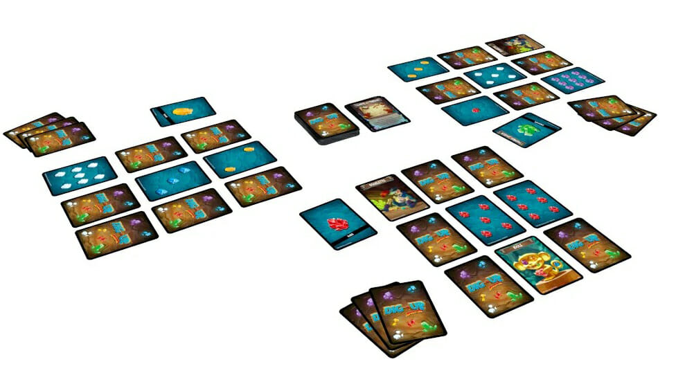 Dans DIG UP Adventure, chaque joueur reçoit 9 cartes face cachée, qu’il dispose en 3 colonnes de 3 cartes pour constituer sa Mine. Avant de démarrer la partie, la carte du milieu est retournée face visible.