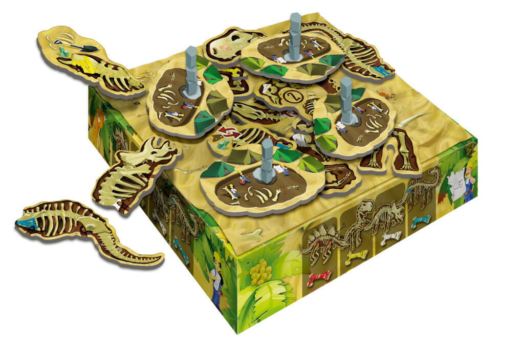 Le joueur tente d’attraper délicatement une tuile fossile de dinosaures. Il collectionne les pattes, têtes, queues et corps des dinos ainsi récupérés. Soit il assemble des tuiles du même dinosaure ce qui forme un dino authentique (il gagne 10 points), soit il assemble des tuiles de dinosaures différents, ce qui forme un dino rigolo (il gagne 6 points). Dès que 5 dinos sont assemblés le joueur ayant le plus de points remporte la partie.