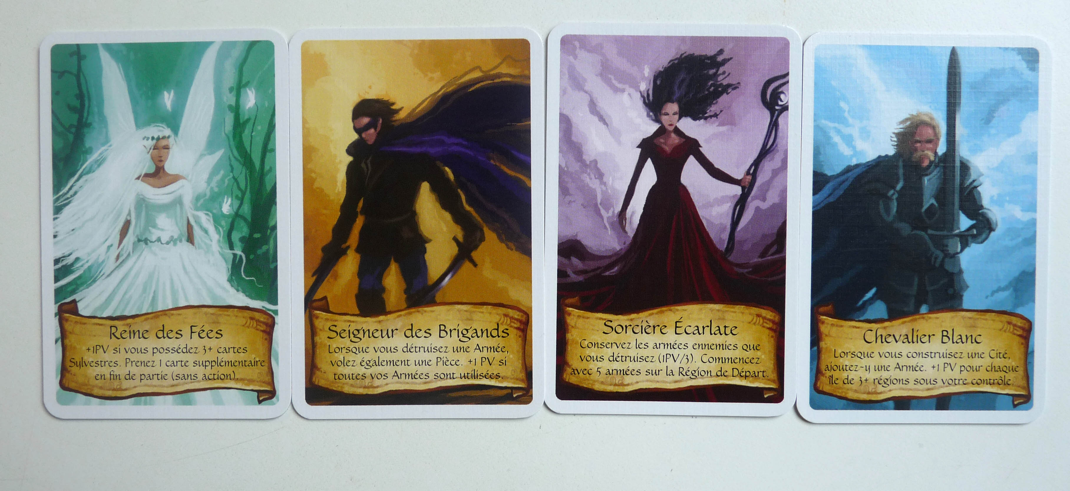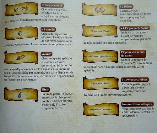 Capacités spéciales : +1 déplacement, +1 armée, PV pour des séries de cartes, immunisé aux attaques, volante : Chaque capacité spéciale « Volante » en votre possession réduit de 1 le coût de vos déplacements sur l’eau, etc.