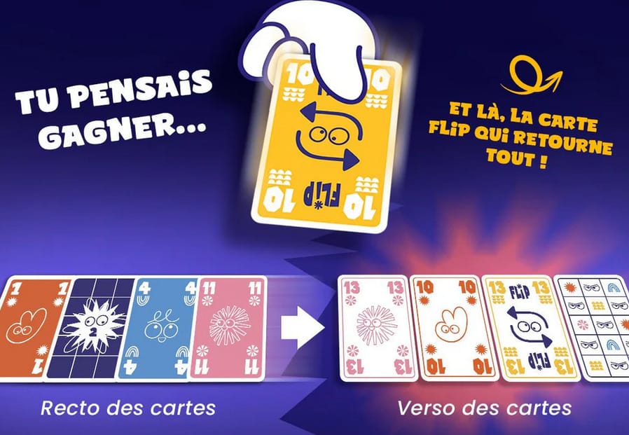 Dans ce jeu rythmé et déjanté, la tension monte à chaque tour : tout le monde avance vers son objectif… jusqu’à ce qu’une carte Flip vienne tout chambouler. Et là, vlan ! tout le monde retourne son jeu : il va falloir s’adapter… vite !