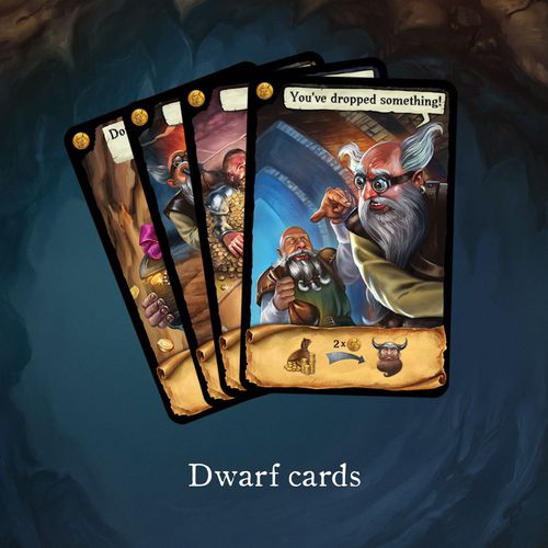 Dwarves in Trouble est un jeu de cartes facile et dynamique. Les participants jouent le rôle de chercheurs de trésors nains qui ont décidé de visiter la tanière d'un dragon pendant que le dragon était absent. Ils ont réussi à entrer. Malheureusement, alors qu'ils pillaient le trésor, le dragon revint à l'improviste. Il est de notoriété publique que les nains tendent à être cupides et que le fait de jeter les précieuses choses serait considéré comme un déshonneur. Pour cette raison, vous devez vous débarrasser du trésor d'une manière intelligente ...