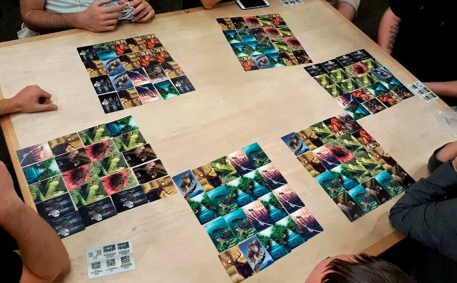 Ecosystem est un jeu de cartes dans lequel les joueurs choisissent des cartes et les placent tour à tour dans leur zone de jeu. Les cartes de la grille d'un joueur constituent son propre écosystème personnel. À la fin du jeu, un joueur aura vingt cartes dans son écosystème, le jeu comprenant onze types de cartes. Les ours marquent des points en étant placés à côté des abeilles et des truites, les truites marquent des points en étant placées à côté des ruisseaux et des libellules, et les ruisseaux sont comparés à la fin du jeu, le joueur qui a le plus grand ruisseau gagnant des points. Ce ne sont là que quelques exemples du fonctionnement du système de notation dans Ecosystem. N'oubliez pas de vous diversifier !