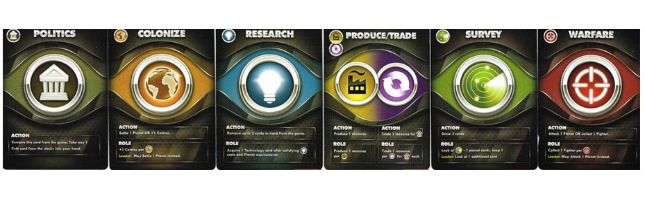 •  phase rôle : on joue le rôle de la carte en piochant la carte rôle associée et en potentiellement l'améliorant en défaussant des cartes de même symbole. Les autres joueurs peuvent appliquer aussi le rôle ou y renoncer en piochant une carte.