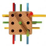 Une structure (un haut pavé transpercé de trous alignés formant plusieurs étages de trous) en bois dans laquelle on va insérer des tiges en bois de part en part.