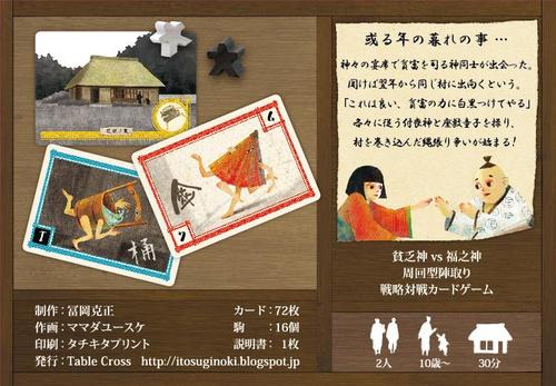 Après avoir posé de façon totalement aléatoire les douze cartes « village » qui composent le plan de jeu (7 sont à la couleur du Bimbogami et 7 à celle du Fukunokami), les joueurs posent leur 7 pions noirs ou blancs au centre du plan de jeu. Chaque joueur a un deck personnel, composés tous deux des mêmes cartes. Les cartes sont de 6 couleurs différentes et ont des valeurs qui vont de 1 à 4, auxquelles s’ajoute une carte spéciale pour chaque couleur. Ces cartes spéciales ont toutes des effets différents. Ces cartes représentent différents Youkai : 傘、臼、桶、釜、鏡 et 鍬, (dans l’ordre, l’ombrelle, l’usu, le seau, le cuiseur de riz, le miroir et la houe). À son tour, un joueur pose une carte de la valeur qu'il souhaite en-dessous de la carte village dont son pion est le plus proche. Une seule règle de pose s'applique... Vous ne pouvez pas poser une carte d'une couleur déjà existante dans le village. Cette règle inclut aussi les cartes villages, toutes associées à une couleur précise.Les joueurs vont ainsi poser des cartes pendant plusieurs longues minutes, en essayant de lire rapidement les cartes déjà posées par leur adversaire pour prendre l'avantage sur chaque carte village.