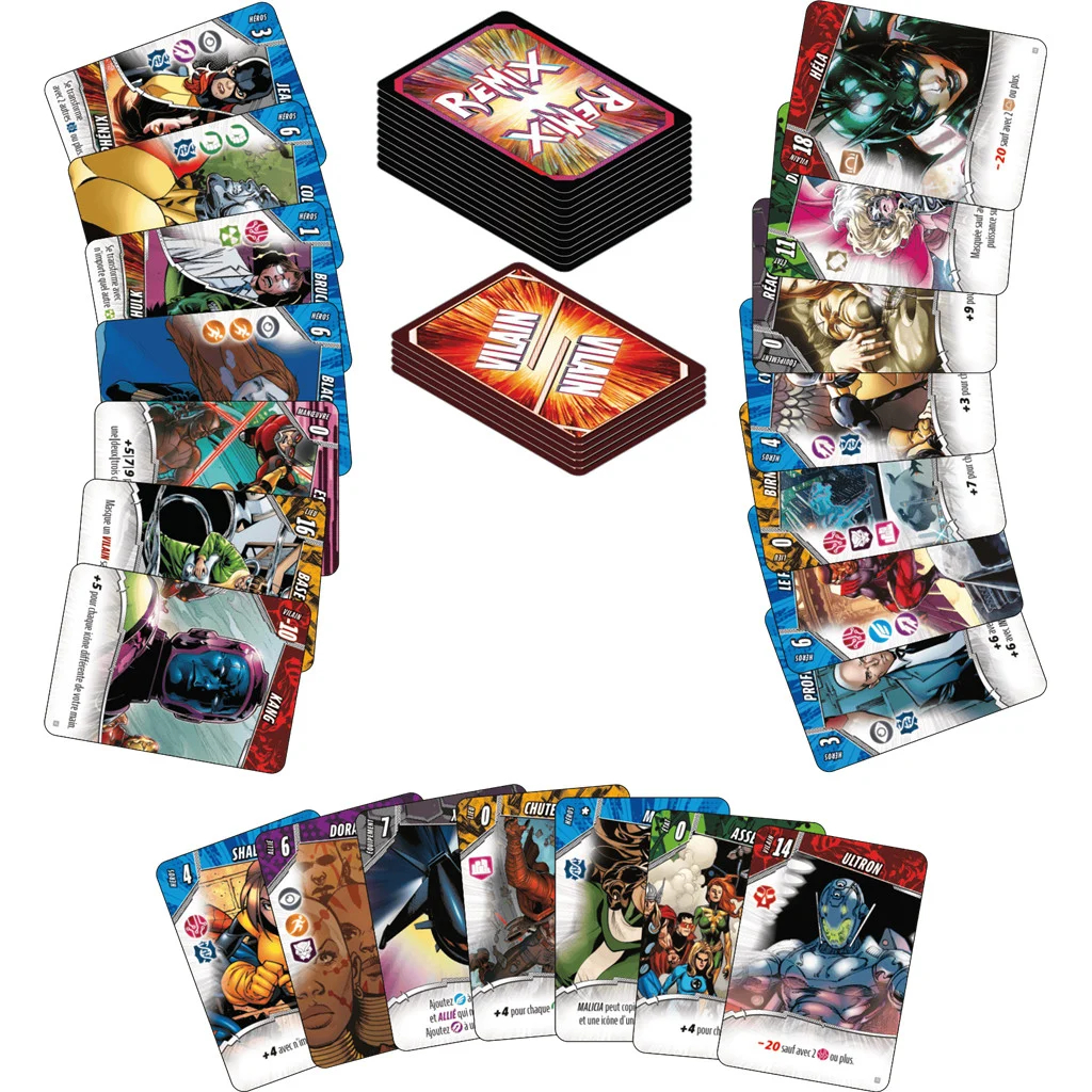 Dans Marvel: Remix, vous devez assembler la main de 7 cartes au score le plus élevé possible. À chaque tour, vous piochez des cartes des paquets Remix, Vilain ou de la zone de défausse avant de choisir une carte à défausser. Chaque carte possède sa propre force de base et peut se combiner avec d’autres cartes de votre main. En fin de partie, vous additionnerez la force de base et les points bonus de toutes vos cartes. Votre main finale doit comporter au moins un HÉROS (ou un ALLIÉ), et au moins un VILAIN, sous peine de ne rapporter aucun point.