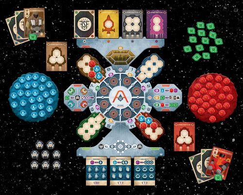 Pendant la 1ere phase "Foundry Alph", vous creusez pour trouver du skyrite (cristaux bleus) et du rubion (minerai rouge) afin de le traiter pour en faire du galactium (métal violet). A votre tour, vous jouez une carte qui vous permet soit de faire atterrir une navette sur une baie d'amarrage soit d'en décoller d'une. La navette transportera des matières premières. Chaque baie d'amarrage a une capacité spéciale si elle est activée, comme le traitement du minerai ou une action commerciale galactique.