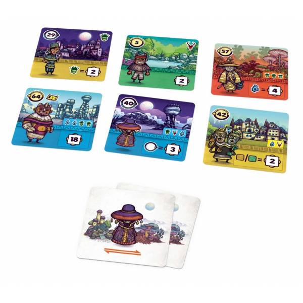À chaque tour, vous jouez une carte d'une main de 3, puis vous piochez une nouvelle carte dans une rivière face visible. Comme le jeu est simultané dans Faraway, vous devez tenir compte d'un astucieux système de priorité dans tous vos choix - être le dernier à choisir une carte vous laisse moins d'options et souvent des choix moins rentables pour les tours suivants.