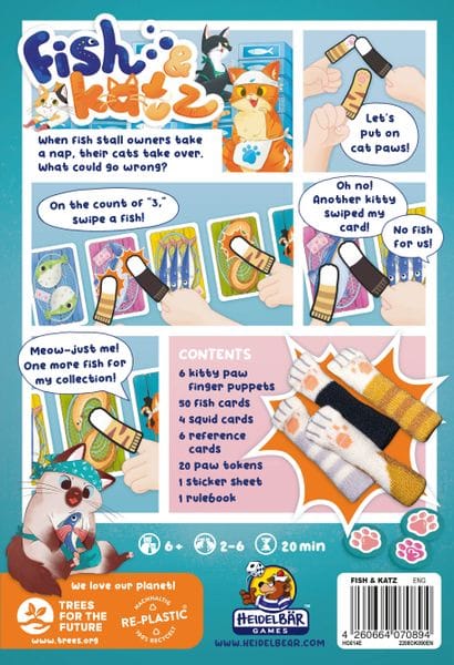 Fish & Katz, d'abord sorti sous le nom de Cat's Tsukiji, est un jeu de rapidité sans pareil, car vous devrez enfiler l'élément de jeu le plus mignon au monde : les pattes de chat en tissu ! Vous pouvez choisir le tissu de vos pattes de chat préférées, comme c'est mignon ! À chaque tour, un certain nombre de cartes de poisson sont affichées sur la table. À trois, tous les joueurs pointent simultanément leurs « pattes » vers la carte poisson qu'ils souhaitent. Si vous êtes le seul joueur à pointer une carte, vous l'obtenez pour un score de collection. Cependant, si un autre joueur pointe la même carte que vous, aucun d'entre vous n'obtiendra le poisson !