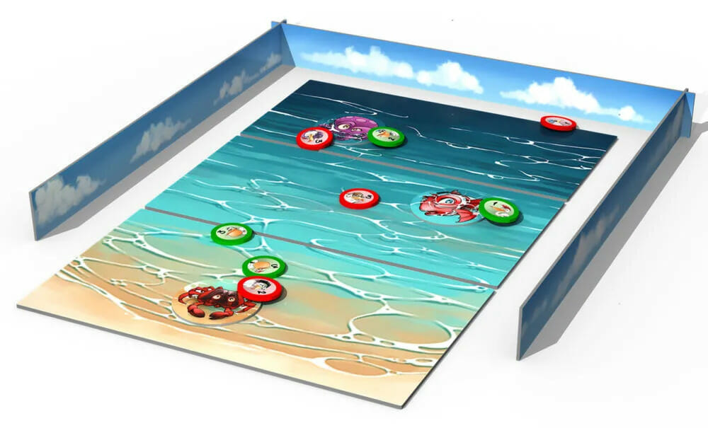 Chaque équipe dispose de 12 palets de valeur 1 à 3. À tour de rôle, ils en jettent un de leur choix en visant un poisson, une zone de la plage ou les palets adverses ! Une fois tous les palets lancés, on calcule la somme des valeurs des jetons sur chaque cible et sur chacune des trois zones de la plage. Les points sont attribués pour chaque à l'équipe majoritaire et la manche revient au plus grand total.