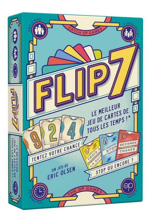 Retournez les cartes une par une sans retourner deux fois le même chiffre. Ça vous semble facile ? Détrompez-vous ! Ce n'est pas n'importe quel jeu de cartes... Dans Flip 7, il n'y a qu'une seule carte 1, deux 2, trois 3, etc. plus un tas de cartes spéciales qui peuvent vous rapporter des points supplémentaires, vous donner une seconde chance ou vous bloquer, vous ou vos adversaires. Êtes-vous du genre à jouer la sécurité et à accumuler des points avant de vous effondrer, ou allez-vous tout risquer et tenter d'obtenir des points bonus en retournant sept cartes d'affilée ?