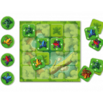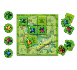 Contenu : 36 tuiles carrées (grenouilles et serpents), 4 marqueurs ronds de grenouilles, 1 plateau de jeu, Livret de règles