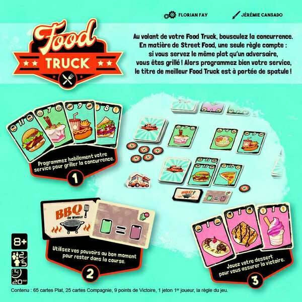 Au volant de votre Food Truck, bousculez la concurrence. En matière de street food, une seule règle compte : si vous servez le même plat qu’un adversaire, vous êtes grillé !