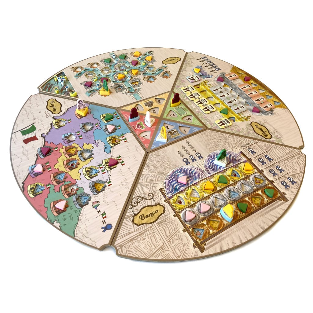 Formaggio est un jeu de placement simultané dans lequel les joueurs placent des ouvriers pour fabriquer du fromage et récolter des ressources dans le quadrant du plateau qui leur fait face. Une fois que tous les joueurs ont placé leurs ouvriers, le plateau pivote, affinant ainsi le fromage fabriqué et présentant à chaque joueur un nouveau quadrant dans lequel placer ses ouvriers.