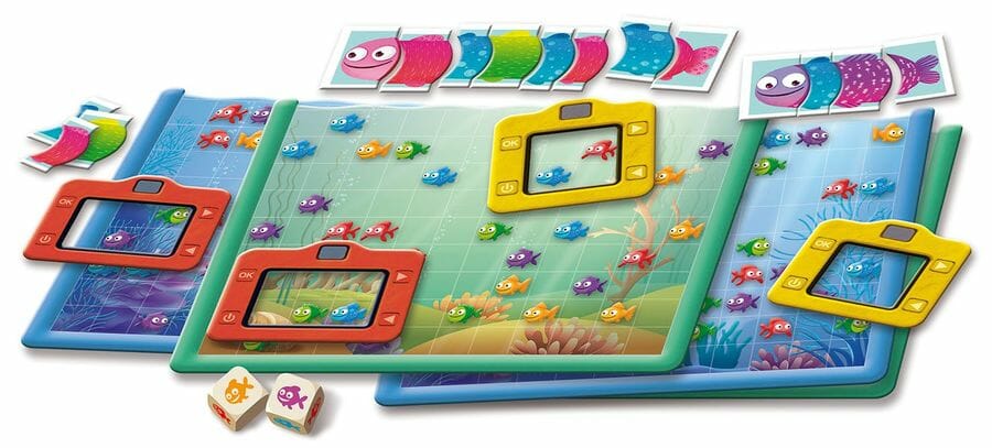 - 2 plateaux de jeu-aquariums avec 24 détails interchangeables, 4 appareils photo de deux tailles différentes, 4X10 détails de poissons de couleurs différentes, 2 dés