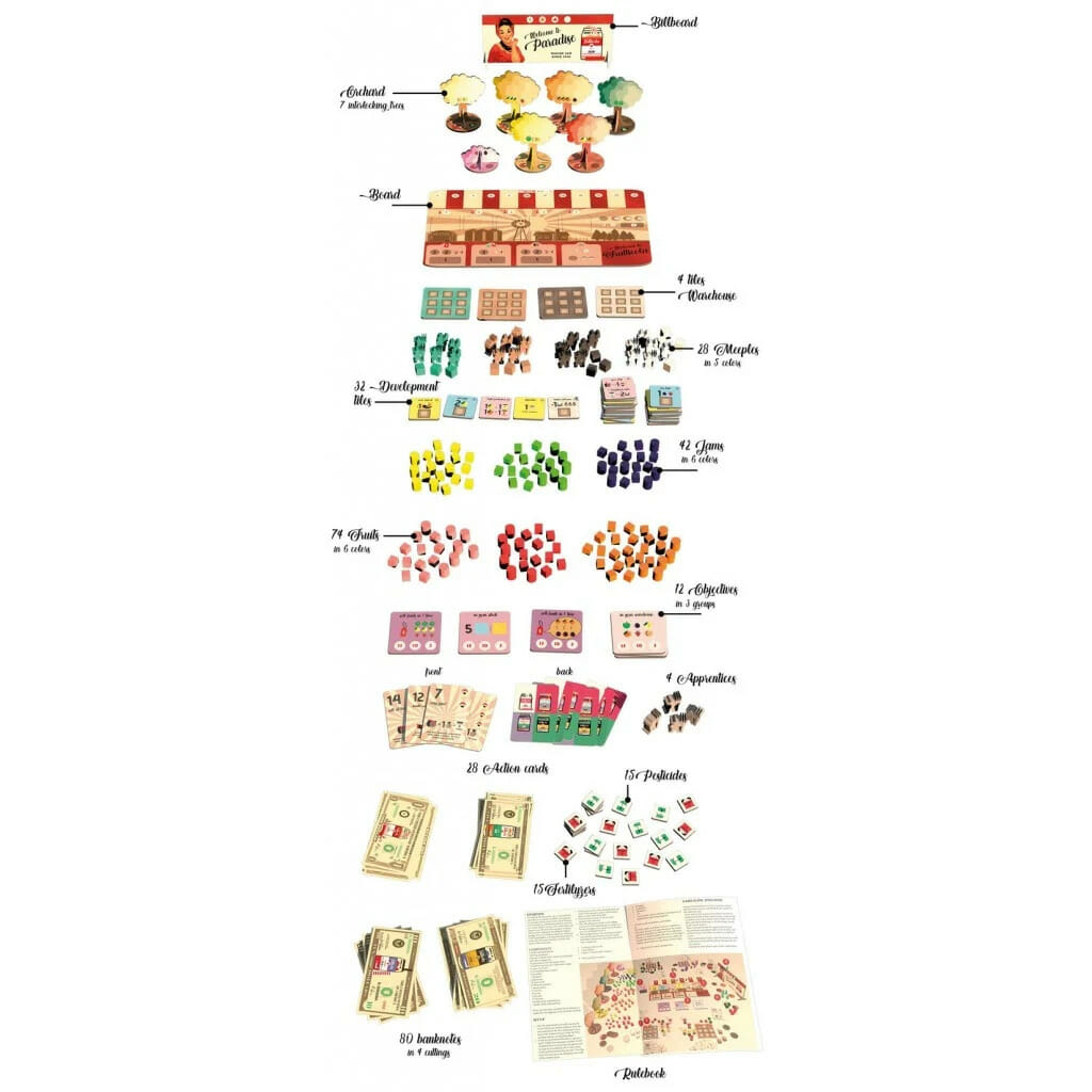 La version française inclut 144 pions en 3D et en couleurs: 74 fruits - pommes, fraises, mûres, pêches, citrons et oranges - et des bocaux de confiture (42, de 6 types différents). Elle inclut de plus l'extension "Ressources Initiales" de 20 cartes, ainsi que tous les autres bonus de la campagne Kickstarter.
