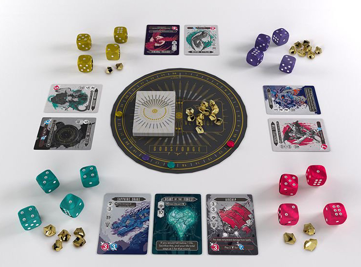 Godsforge propose un jeu à actions en simultané, chaque joueur attaquant le joueur à sa gauche et défendant contre le joueur à sa droite. Lors d'un tour, tout le monde lance simultanément quatre dés, puis chaque joueur pose une de ses quatre cartes face cachée devant lui. Dans n'importe quel ordre que vous voulez, les joueurs révèlent ces cartes, en payant leur coût via des nombres spécifiques sur les dés lancés, la somme des dés lancés, des veilstones ou une combinaison des éléments ci-dessus. Sur les dés, les 1 peuvent être n'importe quel nombre que vous souhaitez, tandis qu'un 6 inutilisé peut être dépensé pour acquérir un veilstone.