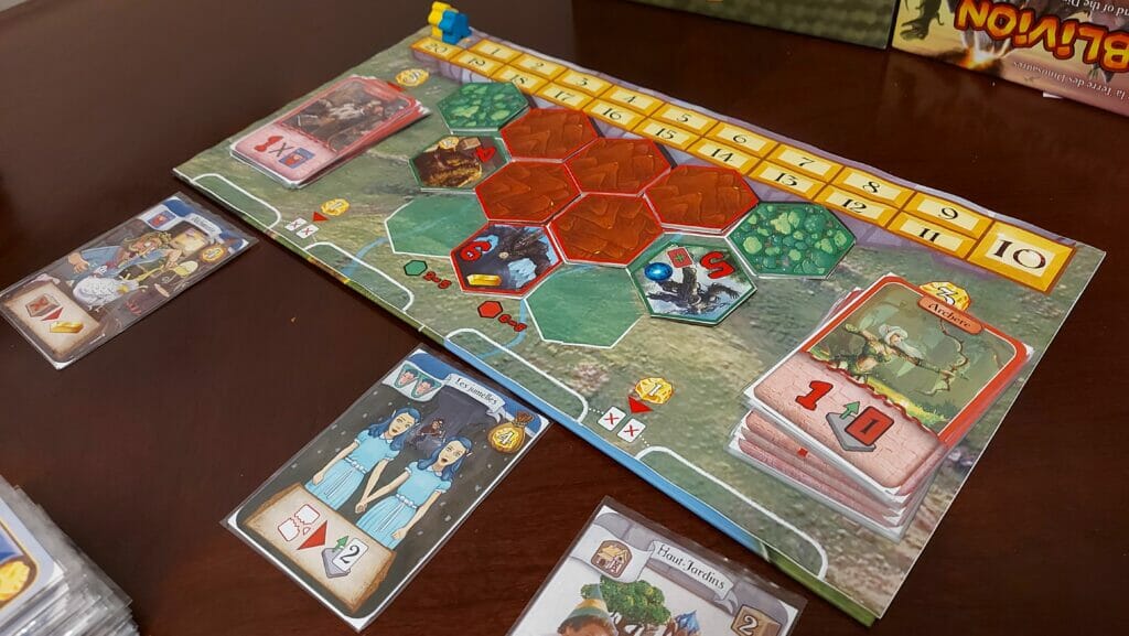 Dans GOLDblivion, vous avez deux jeux de cartes à gérer : un pour le combat et un pour le développement. Chaque tour commence par le retrait d'une carte de votre main. Cette carte est placée sous une section choisie de votre plateau de joueur et donnera une ressource précieuse tout au long de la partie ! Ce processus va aussi naturellement nettoyer votre deck des mauvaises cartes.