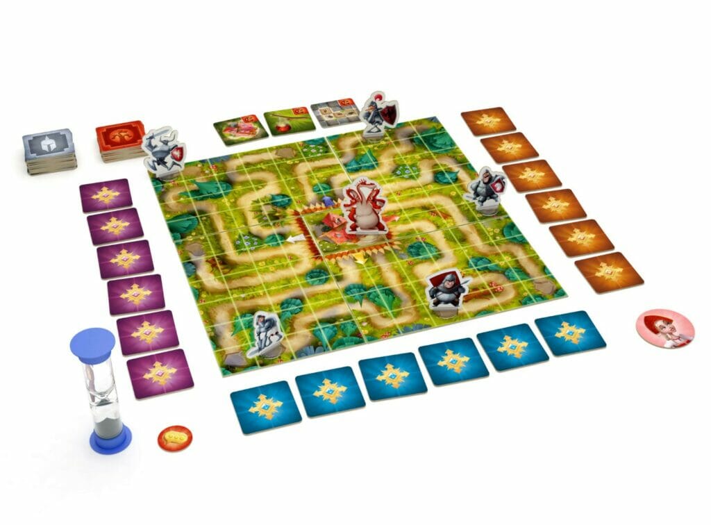 - 1 tuile centrale avec un château 4 plateaux double-face avec des chemins 1 jeton premier joueur 10 silhouettes Chevalier 1 silhouette Gorynich 11 socles pour les silhouettes de Gorynich et des chevaliers 7 jeux de cartes Action avec des dos individuels (6 cartes par jeu) 12 cartes Mouvement (6 cartes Chevalier et 6 cartes Gorynich) 9 tuiles Manœuvre double-face 2 jetons Effet spécial 4 jetons Parole 1 sablier de 30 secondes