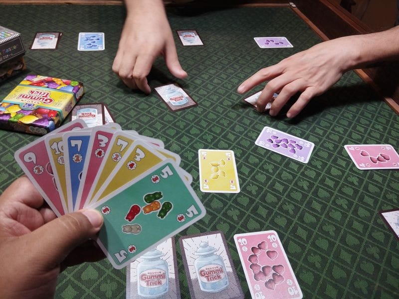 Gummi Trick est un jeu de tirage de plis. Cependant, contrairement aux jeux de plis traditionnels, il y a un gagnant pour chaque couleur et non pour chaque pli. En plus de votre main normale, vous jouez avec des cartes cachées qui sont secrètes. -description de l'éditeur