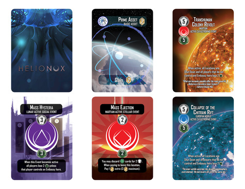 Helionox: The Last Sunset est un jeu de deckbuilding se déroulant dans un futur lointain. Les joueurs s'y confrontent pour gagner de l'influence en obtenant des technologies puissantes et des agents, en construisant des ambassades dans d'autres mondes et en surmontant des crises environnementales. A leur tour, les joueurs achètent des cartes du marché avec des crédits et les intègrent à leur paquet pour la suite de lapartie. Les joueurs peuvent aussi essayer de surmonter un ou plusieurs désastres qui ravagent les colonies humaines en dépensant des points de défense octroyés par leurs cartes. Les joueurs peuvent construire des combinaisons de plus en plus force pour acquérir de l'influence. Mais le temps presse ! Une fois la dernière carte du paquet d'événements jouée, la partie est finie. Alors, le joueur avec le plus d'influence gagne.