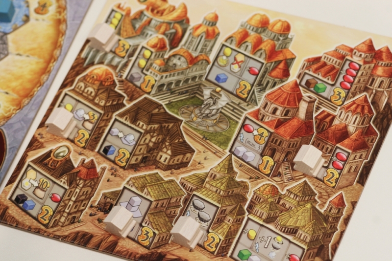 une pierre de mana : votre 1er temple vous rapportera qu'une pierre de mana, mais le 2e en rapportera deux, etc. Les temples rapportent des points de victoire. L'avantage des bâtiments, c'est qu'ils apportent toutes sortes d'effets qui sont permanents ou "one shot" (fonctions spéciales, bonus à la fin de partie, des pierres de mana ou permettre de bouger son marqueur d'avancement du soleil).